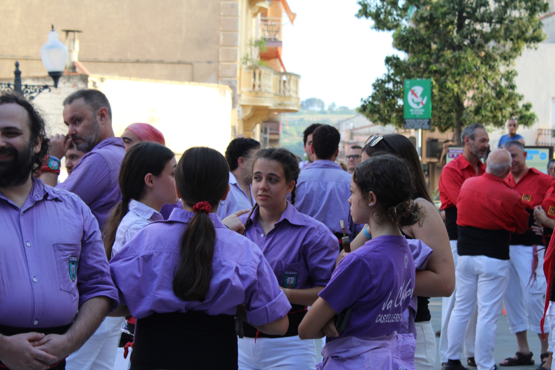 L’actuació inicialment estava prevista amb 3 colles. Els Castellers d’Esparreguera que exercien de colla amfitriona i organitzadora de la Diada i els Xicots de Vilafranca. Però finalment se’ns va fer saber la presència d’una quarta colla els Castellers d’Esplugues. Els Castellers d’Esparreguera són una colla que en els darrers anys han mostrat una bona regularitat amb els castells de 7 i mig, i que sempre mouen una xifra prou nombrosa de camises. Tot i que els està costant fer el salt a castells superiors com el 4 de 8 (en van fer un intent infructuós la temporada passada) o el 2 de 7, sí que mostren un bon domini de castells com el 5 de 7 i el 4 de 7 amb el pilar, tal com ens van mostrar a plaça. Els van acompanyar d’un ferm 4 de 7.