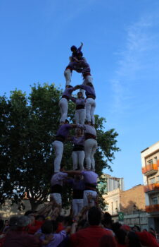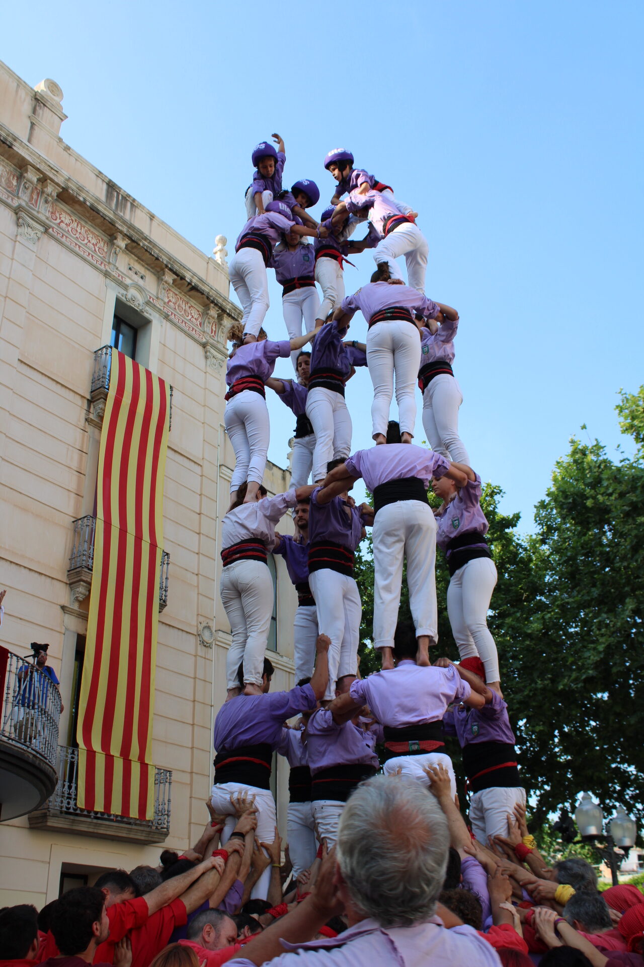Així doncs, a allò on anàvem. A explicar els castells que vam fer enguany. Som-hi! De sortida dos pilars de 4 i en primera ronda teníem previst atacar l’objectiu principal, el 5 de 7. Però després del primer castell d’Esparreguera, les altes temperatures de fora de l’ombra de la plaça van jugar una mala passada a un vianant que va haver de ser atès per l’ambulància que donava servei a l’actuació. Vam haver d’esperar que aquesta persona fos atesa, cosa que hem de confessar que ens va anar bé perquè arribessin un parell de peces importants de la pinya a plaça i poguéssim tirar amunt el castell amb tots els efectius disponibles. Afortunadament, tot va quedar en un ensurt i ara sí, enfilem els segons del 5 de 7 damunt la pinya. De seguida li veiem bona mida i el cap de colla dona l’ordre. Terços del tres, amunt! El castell puja impecable fins a la carregada. I tot i que a la descarregada la rengla va patir de valent i es va estirar ajuntant-se perillosament a la torre, vam poder descarregar el castell, amb esforç, però sense que perillés en cap moment.