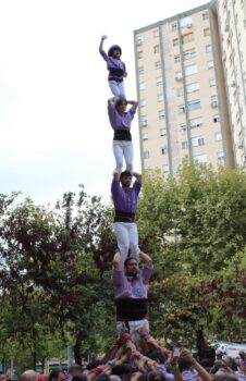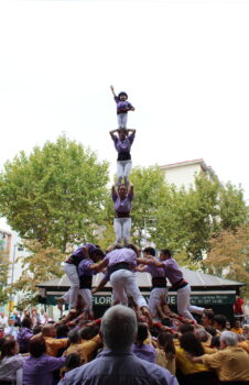 Enguany també volíem portar bons castells i ho demostràvem de sortida obrint plaça amb el 5 de 7. Un castell que tot i que se’ns va estirar de la rengla, i a la part de la descarregada es va haver de treballar amb màxima concentració. Tot i això, vam descarregar-lo sense que perillés en cap cas. No va ser un 5 perfecte, però sí que vam mostrar-hi el nostre domini i la nostra confiança enguany amb aquesta estructura (el 6è cop que la descarreguem enguany). En segona ronda tocava anar pel 4 de 7 amb el pilar, castell que ja havíem fet el dia abans a la festa major de Sant Feliu. És un castell que descarreguem amb aparent facilitat, però que ens continua donant problemes d’encaix i això no permet que tots els rengles de baixos i segons treballin amb comoditat. Tot i això, és un castell que enguany tenim prou dominat. En tercera ronda un lleuger 4 de 7, amb l’estrena d’una terça. El treball que anem fent amb el 4 de 7 ens dona més eines per a recuperar el castell de vuit a mitjà termini. A poc a poc, però anar-hi encaixant peces. Vam tancar amb un nou pilar de 5. Una molt bona actuació davant d’un prou nombrós públic i en un barri que estem convertint en una de les nostres places fortes i en el qual hem de continuar invertint esforços. Sant Ildefons serà un barri Lila, o no serà!