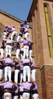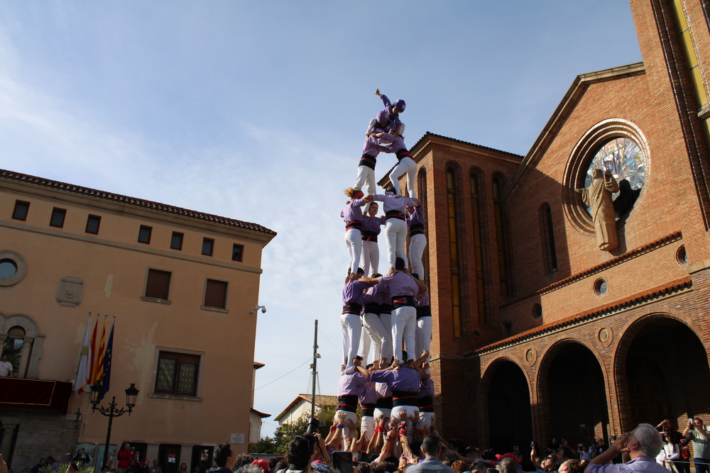 En un matí de diumenge radiant i amb una temperatura ben agradable ens disposàvem a iniciar l’actuació. Per obrir boca dos pilars de 4, un d’ells amb pancarta commemorativa de la declaració fa 15 anys dels castells com a Patrimoni Cultural Immaterial de la Humanitat per part de la UNESCO. Després d’aquest preliminar ens disposàvem a afrontar el primer repte del dia. Sortiríem de 7 de 7. Una estructura que tot i que requereix un gruix de camises important afrontem amb molta confiança i que portàvem a plaça per quarta vegada enguany. Malgrat que és un castell que dominem amb certa solvència el de diumenge no va ser el millor. Desquadrat i amb dificultats de l’aixecador del 4 per remuntar pisos. Val a dir que feia un vent bastant desagradable i que tot i que no era prou fort per fer perillar l’estructura sí que es feia prou molest. Tot i això, el domini que tenim de l’estructura permet que la descarreguem sense excessives angúnies. Així doncs, primer castell al sac. Però calia seguir, que no podem dir blat fins que no sigui ben lligat… I bla, bla, bla…